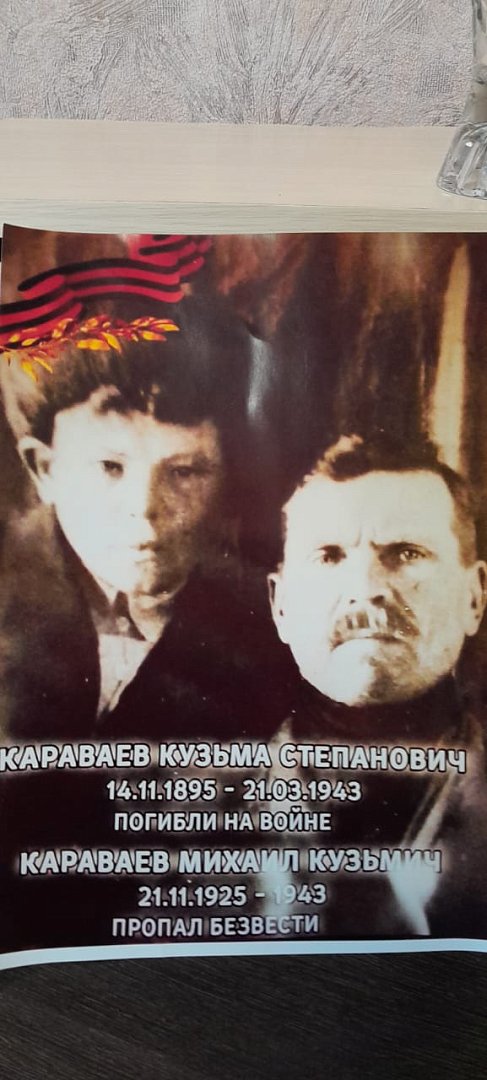 Кузьма Андреевич Караваев погиб на оборонительном участке в Курском направлении. Насмерть стояли бойцы их дивизий. Лишь чернозем тех полей сражений хранит страшные свидетельства войны. Погибшие бойцы, в том числе и он, похоронены в братской могиле. На плите высечены их имена. Но Михаил Кузьмич считается пропавшим без вести. А воевал вместе с отцом, это подтверждено документами.