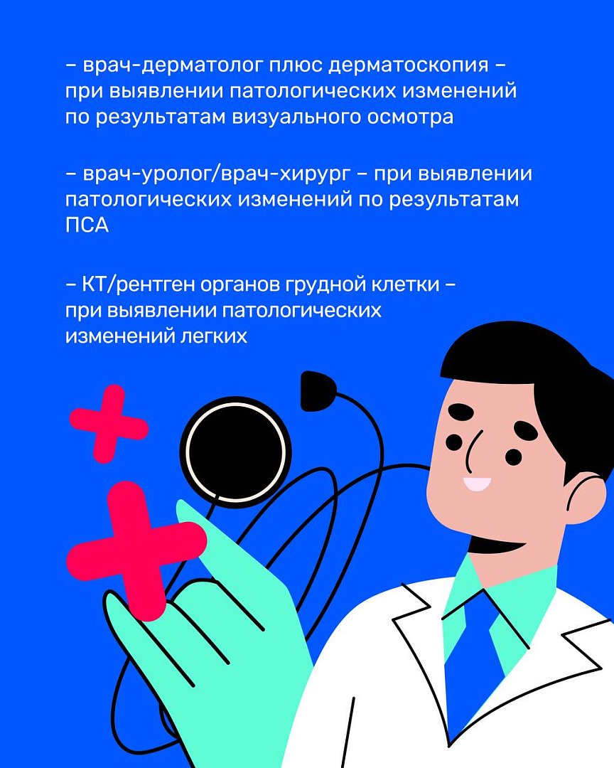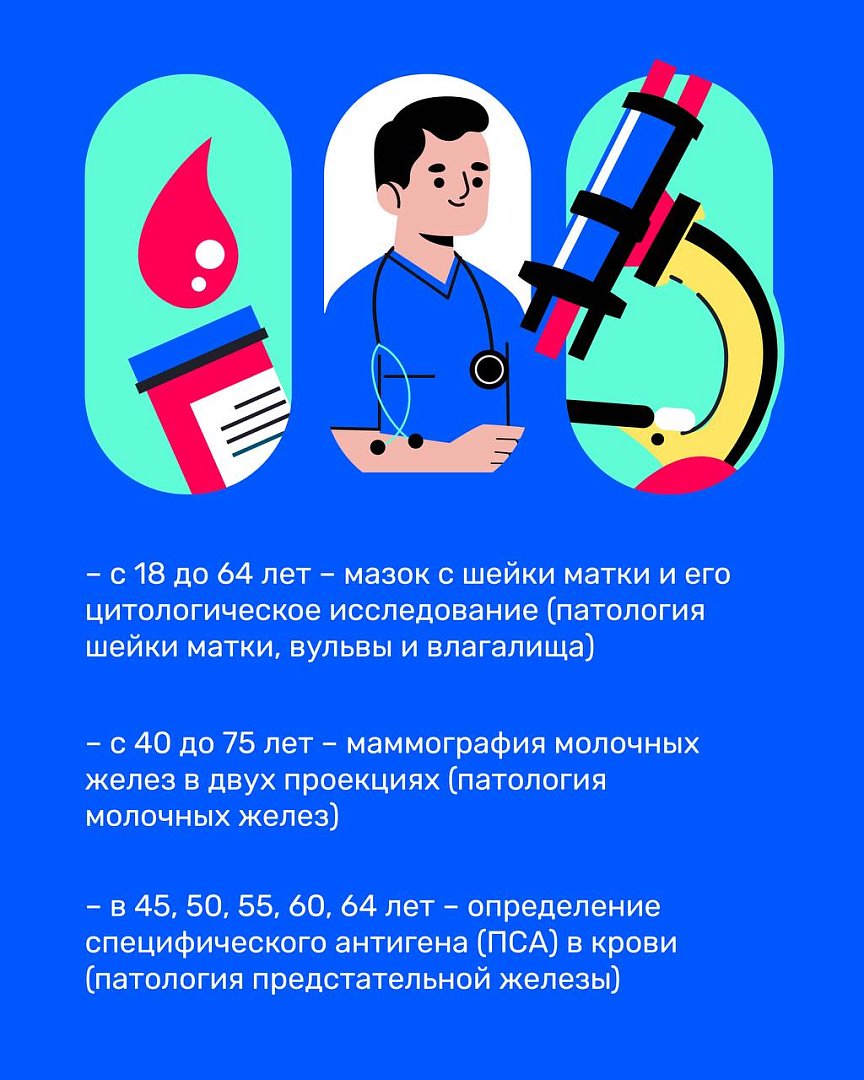 Некоторые патологии могут коснуться любого человека, даже ведущего здоровый образ жизни. И одна из таких патологий — онкологические заболевания. Для того чтобы выявить онкологию, когда еще нет симптомов, необходимо пройти диспансеризацию. Онкозаболевания, обнаруженные на ранней стадии, излечимы в 90% случаев.Диспансеризация проводится в два этапа. Подробнее — в карточках