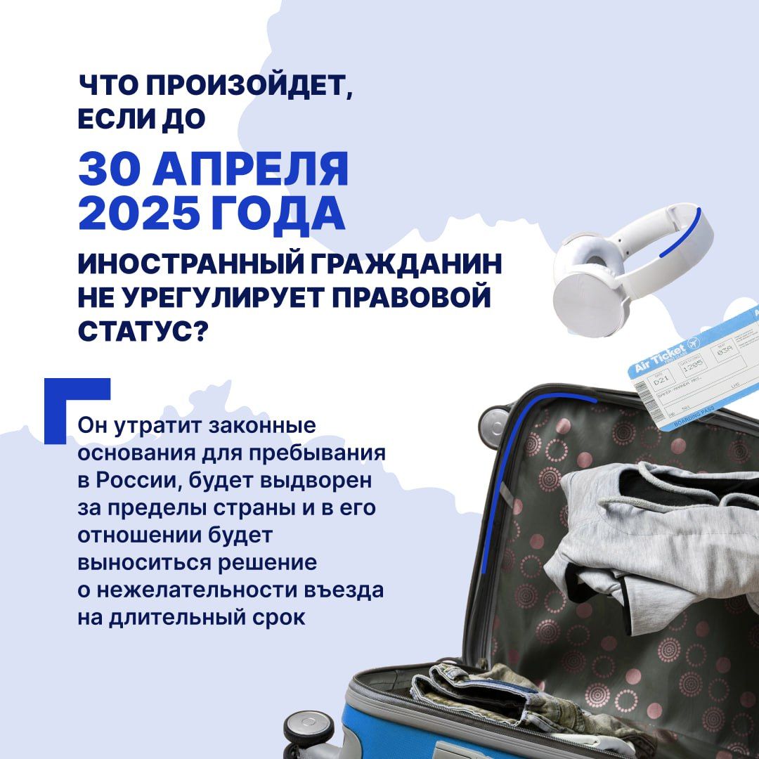 Иностранным гражданам, желающим остаться на территории России, необходимо легализоваться. Для этого необходимо по 30 апреля 2025 года обратиться с пакетом документов в отдел по вопросам миграции территориального органа внутренних дел или в филиал паспортно-визового центра МВД России.