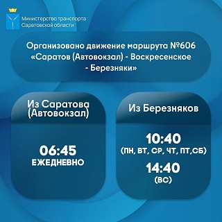 Автобусы курсируют ежедневно по следующему расписанию: от автовокзала Саратова автобус отправляется в 06:45; из Березняков - в 10:40 по понедельникам, вторникам, средам, четвергам, пятницам и субботам и в 14:40 по воскресеньям.