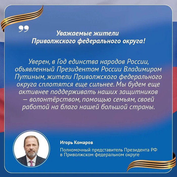 Уверен, в Год единства народов России, объявленный Президентом России Владимиром Путиным, жители Приволжского федерального округа сплотятся еще сильнее. Мы будем еще активнее поддерживать наших защитников — волонтёрством, помощью семьям, своей работой на благо нашей большой страны.