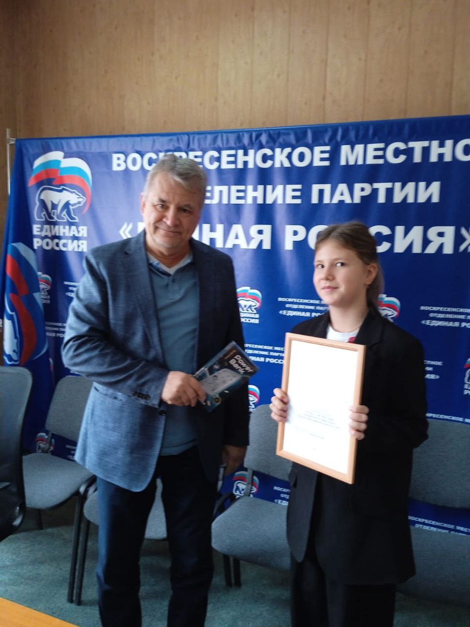 Борзова Мария, ученица 4 класса МОУ «СОШ с.Воскресенское» заняла 3 место. Вместе со своей мамой присутствовала на вручении такой важной для нее награды. Мария, самая младшая из награжденных, проделала большую работу: она собрала историю о герое своей семьи, проявив уважение к прошлому и сохранив ценную память для будущих поколений.