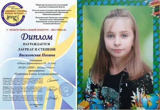 Воспитанница Воскресенской детской школы искусств Василевская Полина приняла участие в V межрегионального конкурса-фестиваля «Звенит струна, рояль играет…» и стала Лауреатом II степени. Организатор конкурса - Министерство искусства и культурной политики Ульяновской области , поздравили Полину и её преподавателя Никитину Е.А. с победой и желаем дальнейших творческих успехов. -