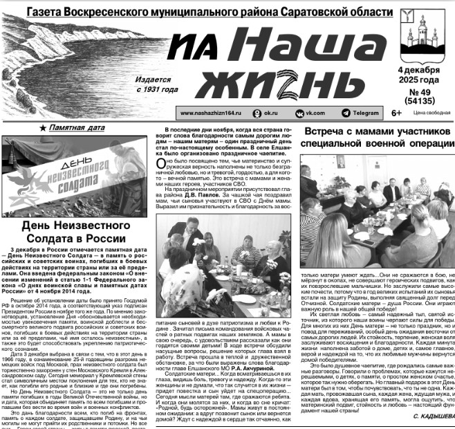 В дни ДЕКАДЫ ПОДПИСКИ на 1-е полугодие 2026 года с участием всех почтовых отделений и почтальонов района подписная цена на газету "ИА Наша жизнь" снижена. По индексу ПО304 на 6 месяцев составит